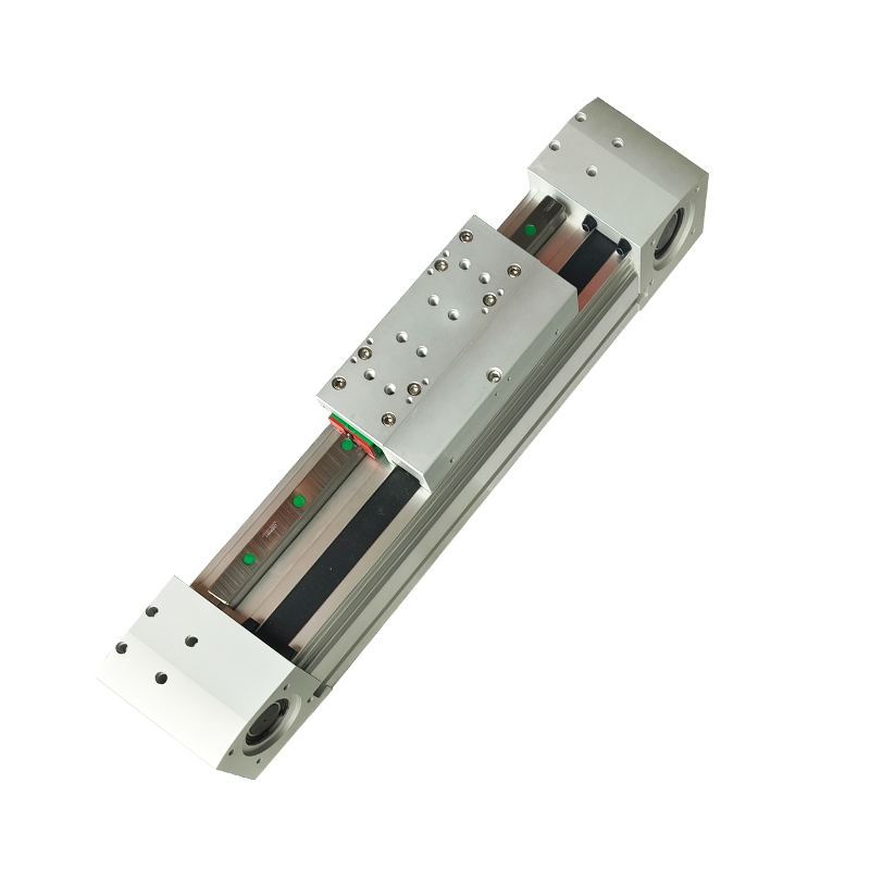 鼎格同步帶直線模組的運(yùn)行依賴一套精密傳動機(jī)制。動力源一般為伺服電機(jī)或步進(jìn)電機(jī),電機(jī)運(yùn)轉(zhuǎn)帶動主動輪旋轉(zhuǎn)。同步帶內(nèi)表面有特定齒形,與主動輪及從動輪的齒槽精準(zhǔn)嚙合,從而將電機(jī)的旋轉(zhuǎn)運(yùn)動平穩(wěn)轉(zhuǎn)化為直線運(yùn)動。在同步帶特定位置固定有滑塊,負(fù)載安裝于滑塊之上,當(dāng)同步帶移動時,滑塊及負(fù)載隨之做直線位移,實現(xiàn)精準(zhǔn)定位與直線輸送。為保證同步帶始終處于最佳工作狀態(tài),模組配備了張力調(diào)節(jié)裝置,通過調(diào)整同步帶松緊度,防止出現(xiàn)打滑現(xiàn)象,確保動力傳輸?shù)姆€(wěn)定性與準(zhǔn)確性,使整個系統(tǒng)能夠持續(xù)、可靠運(yùn)行。例如,在電子元器件貼片環(huán)節(jié),電機(jī)驅(qū)動主動輪,經(jīng)同步帶帶動滑塊上的貼裝頭精準(zhǔn)移動到指定位置進(jìn)行貼片操作